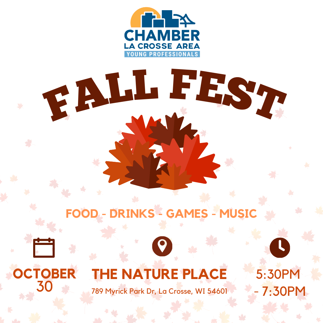 Join us for this year's YP Fall Fest on Thursday, October 30th! Stop by from 5:30pm - 7:30pm for some indoor/outdoor fall fun, food, drinks, and games! This is a casual, laidback event, and we encourage you to bring friends or coworkers who are interested in learning more about the La Crosse Area Young Professionals and meeting new people. Hope to see you there!